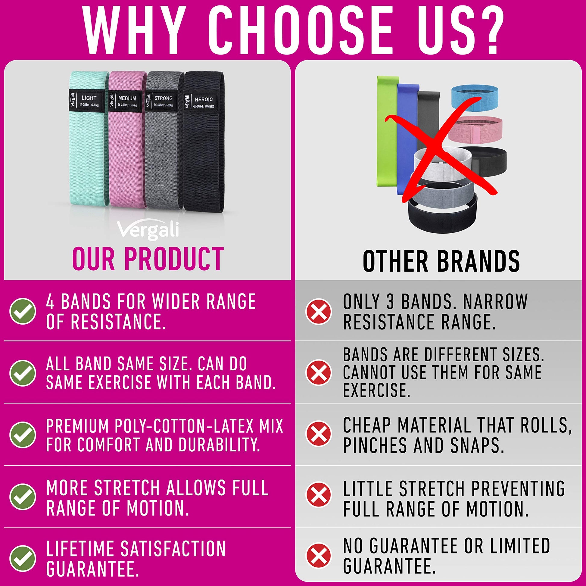 Details: The Vergali Booty Bands includes 4 Resistance Strength bands made with high quality fabric material. The inner side of each band contains a rubber grip to help keep the bands in place while you workout. No more worrying about slipping or sliding during each exercise. The bands also include a carrying case making it ideal for travelling. Bring the bands with you to the gym or workout out at home. You can also access our complete video library of exercises online as well as a training guide to help with your workouts throughout the week.