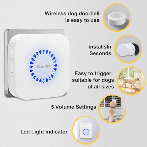 ChunHee Wireless Dog Door Bell, Potty Training to go Outside Light Touch Activation Doggy to Ring to Go Potty,Volume Adjustment (0-110) 55 Ringtones, Includes 2Trigger Buttons and 1Receiver.