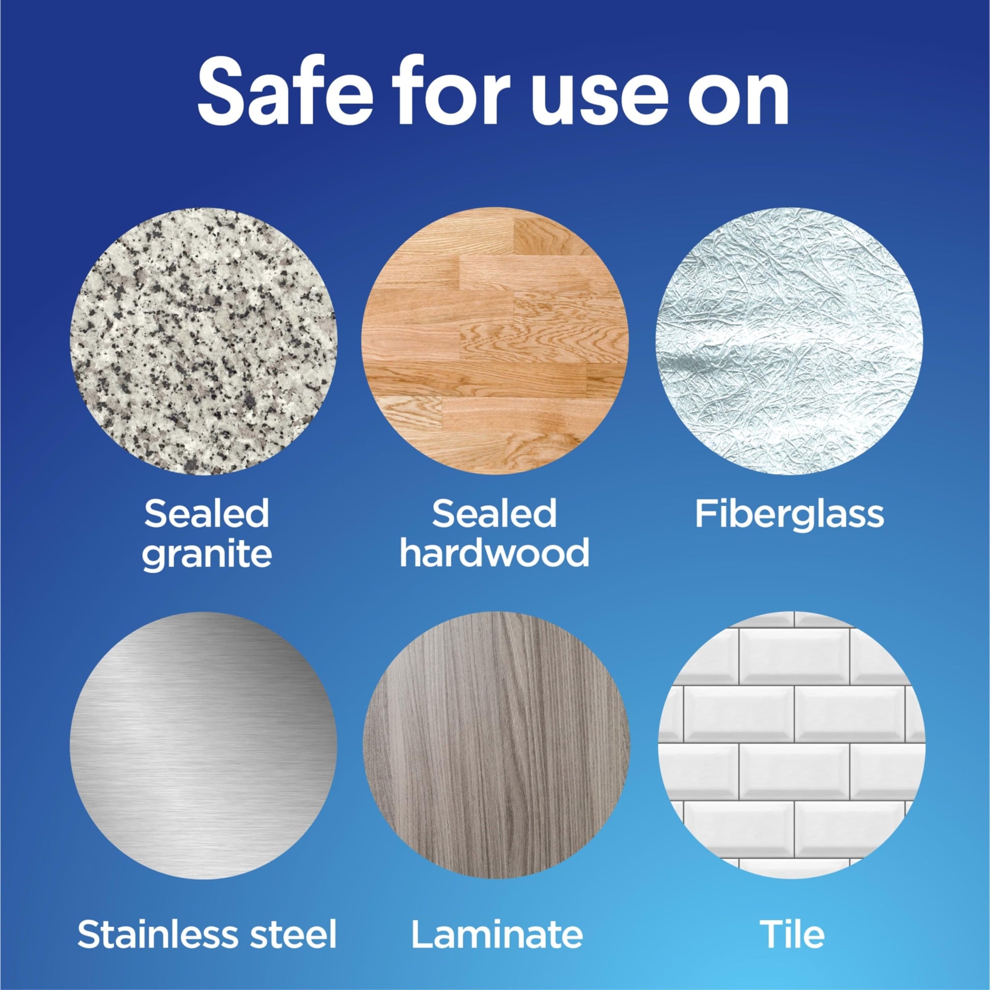 - SAME CLOROX CLEANING POWER*: Use on Stainless steel, glass, appliance exteriors, fiberglass, Formica, sealed granite, glazed porcelain, acrylic, sealed hardwood, laminate floors