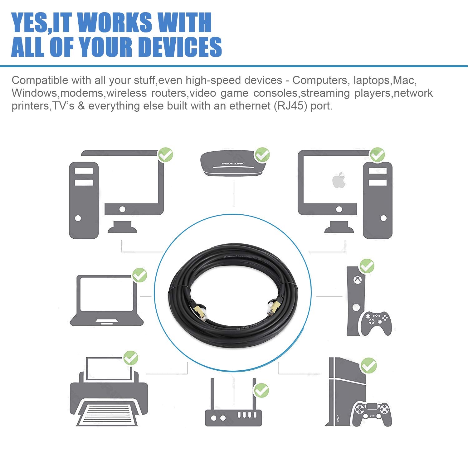 - 【RJ45 Connectors & Wide Compatibility】: With two shielded RJ45 connectors at both ends, the Cat8 Ethernet cable works perfectly with networking switch, IP Cam, routers, Nintendo switch, ADSL, Adapters, Modem, PS3, PS4, X-box, Patch panel, Servers, Networking Printers, Netgear, TP-link, NAS, VoIP phones, laptop, Coupler, Hubs, Keystone jack, Smart TV, Imac and other device with RJ45 connectors. Also compatible with Cat7/Cat5/Cat5e/Cat6/Cat6e.