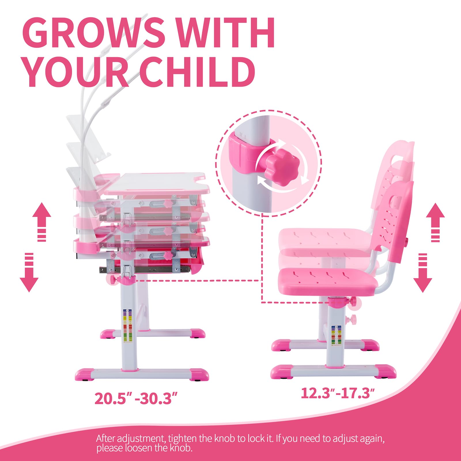 Diroan Kids Functional Desk and Chair Set, Height Adjustable Children School Study Desk with Tilt Desktop, Book Stand, LED Light, Metal Hook and Storage Drawer for Boys Girls(Pink)