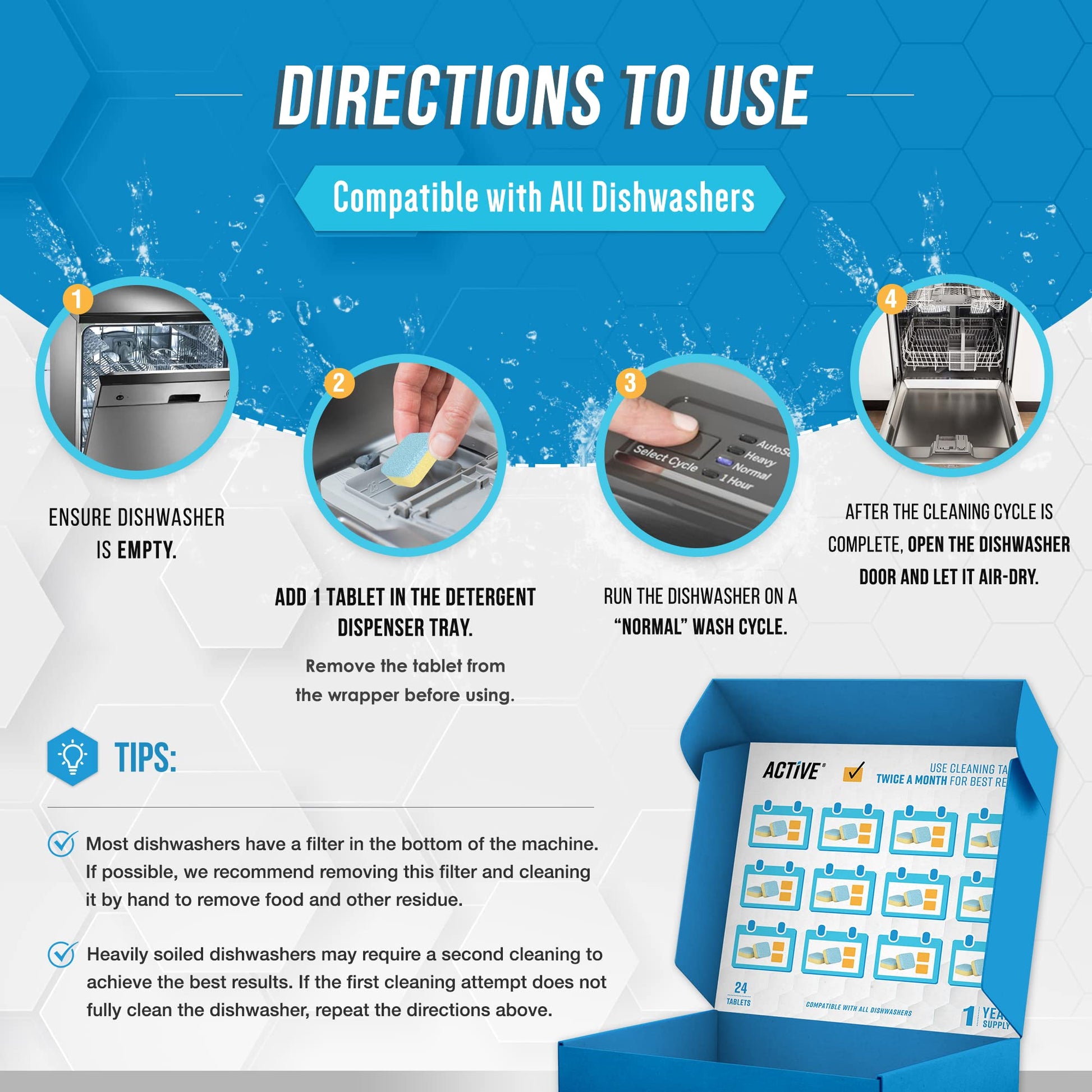 Details: Standard dishwasher detergent pods, prewash, or gels might clean your dishes, but they do not leave your dishwaher squeaky clean. In fact, over time the dishwasher causes soap buildup that must be removed. That's where ACTIVE Original Dish Washer Cleaner Set comes in.