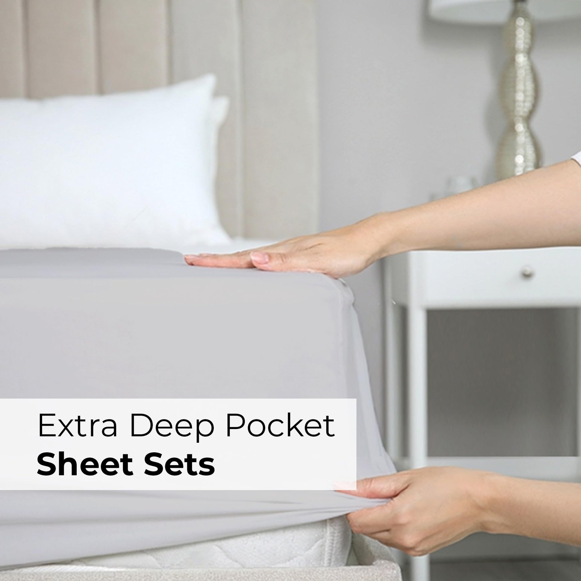 Details: EXTRA DEEP POCKET SHEETS / EXTRA DEEP FITTED SHEETS: These bed sheets are for very deep pocket mattresses. They fit any mattress with pockets that are 18, 20, 21, 22 and 24 inches deep mattresses. There's a stretchable elastic around the extra deep fitted sheet which stretches for a nice tug around your mattress. Perfect for extra tall & large mattresses. Rest assured these oversized sheets will stay on tight & stay in place! GREAT FOR DOUBLE PILLOW TOP MATTRESS: These bed sheets are perfect for mattresses with a 3 inch or 4 inch topper on top, memory foam toppers, big mattress pads, pillowtops, foam toppers, big foam toppers, pillow top mattresses and memoryfoam. These sheets will not come off and they will stay on! MICROFIBER: These are the softest type of microfiber bed sheets we have created. Super soft with a light feel. Not crisp like cotton. If you're accustomed to cotton sheets and you've never tried microfiber sheets we recommend you at least give these a try. They're even softer than Cotton!