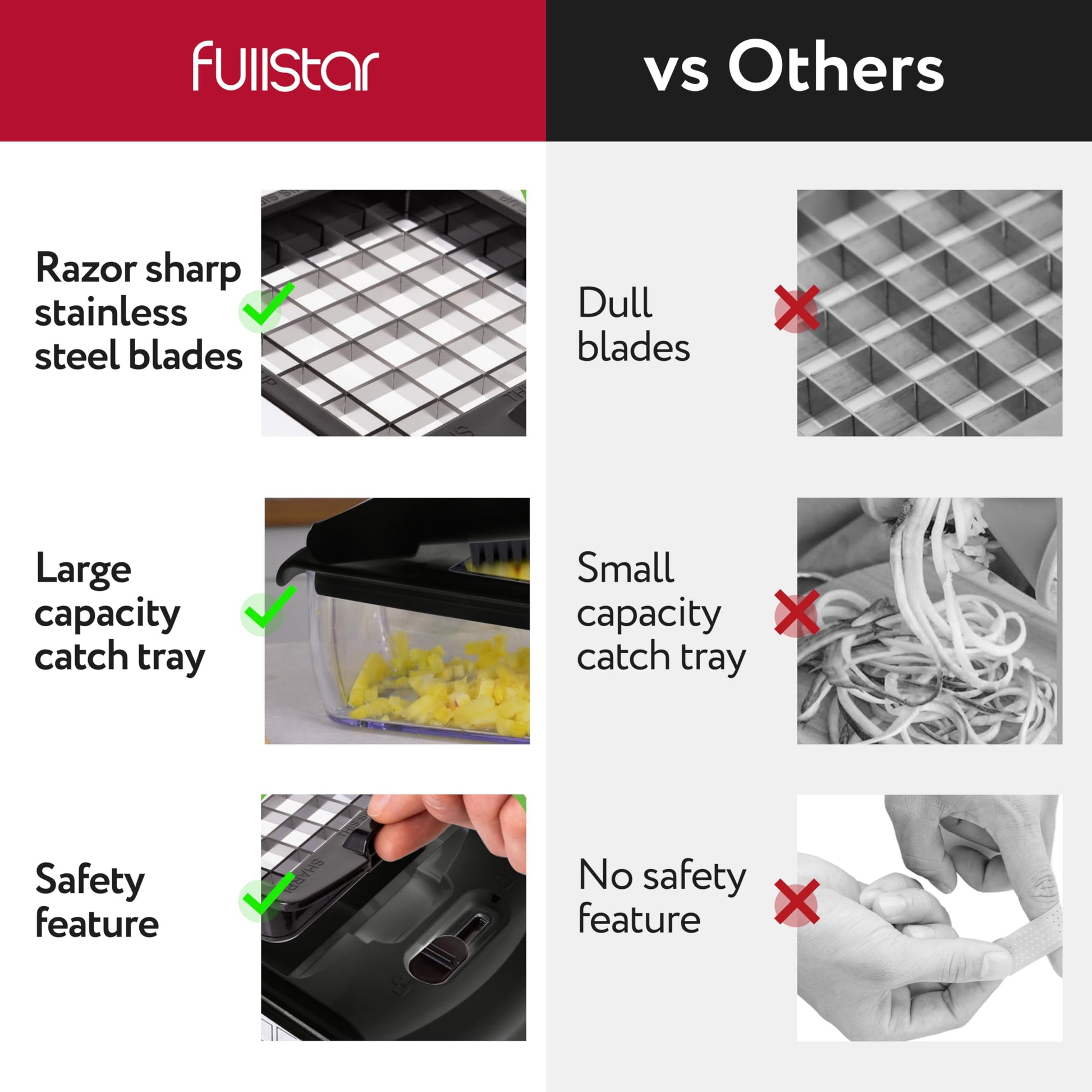 - The Viral Fullstar Vegetable Chopper - The Original Fullstar Veggie Chopper now comes with 2 interchangeable dicer blades! The built-in chop lid lets you cut foods directly into the 1.2L collection tray without the mess of a knife and cutting board. The storage container lets you hold prepared vegetables until you are ready to begin cooking.