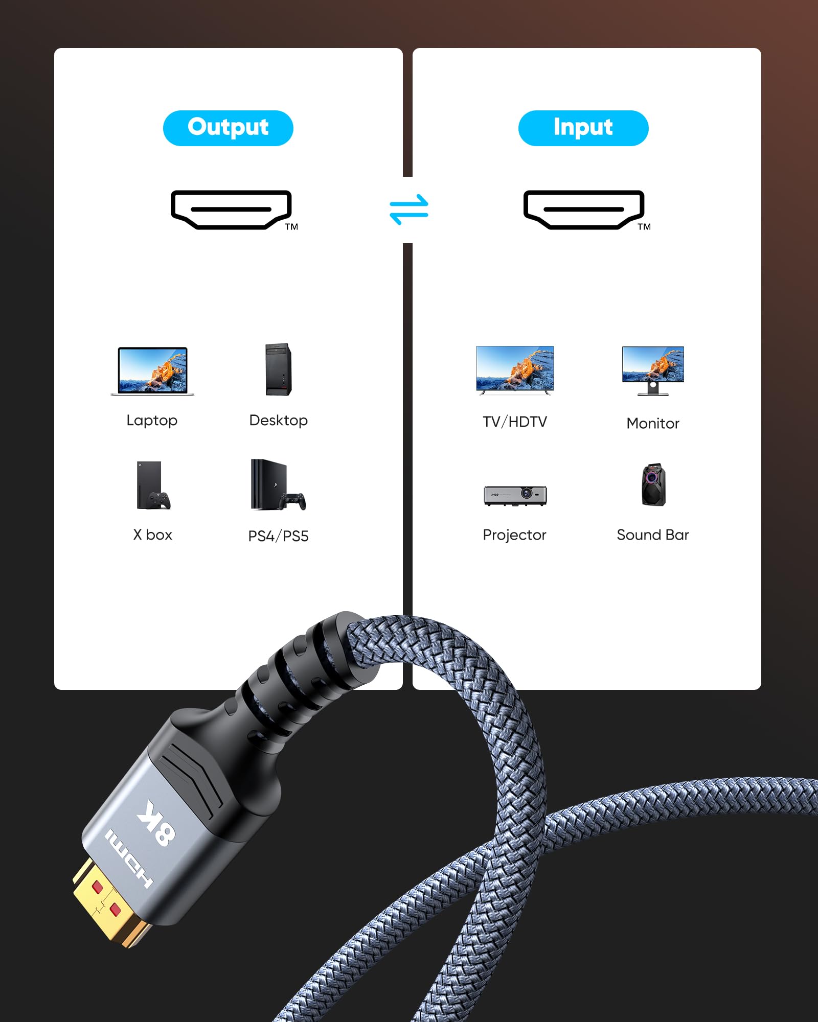 - 【Top Technology----8K@60HZ】 This 8K Ultra High Speed HDMI Cable uses the most cutting-edge technology, is compatible with 8K@60HZ and 4K@120HZ, clearly displays every particle, and accurately processes every signal source. With 8K HDMI's unique dynamic HDR and 12 Bit color processing technology, each scene of the video is every frame, with more ideal depth, brightness, detail, contrast and wider color gamut.