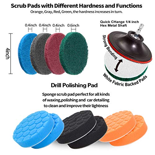 - 38PCS POWER SCRUBBER DRILL BRUSH SET - 4 different size nylon brushes.(4*2inch small brush, 2*2.5inch cone brush, 4*4inch flat brush, 1*5 inch flat brush), 16*scouring pads (4 different stiffness blue, gray, red, green, the hardness increases in turn.) 6* scrub sponges, 2* corresponding scrubber connectors, 2*1/4 shaft, 1*6 inch reach extension. (DRILL IS NOT INCLUDED).