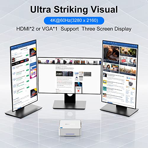 - 【IMPRESSIVE GRAPHICS】--KAMRUI mini computer comes with Intel Graphics 1.20 GHz, Supports HD (4096 x 2160), 4K@60GHz three screen display(2X HDIM+VGA). Images come alive with new levels of realism, text is sharp and clear, and colors are more vibrant. You can enjoy 4K Web surfing, video playback, watching TV, home theater, and enjoy the entertainment with your family. Dual HDMI Ports, easily connecting 3 monitors, reduce waiting time, efficiency doubled Work, Entertaining and Creation.