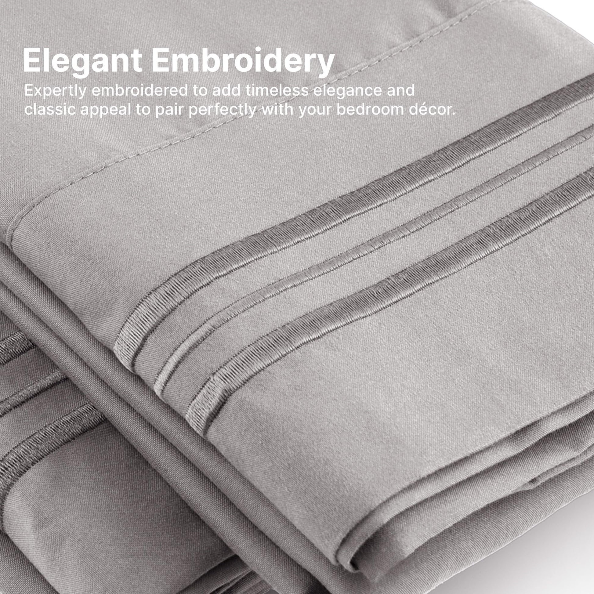 Details: CGK Unlimited 4-Piece King Size Sheet Set with Deep Pockets Many King sheet sets are made of low-quality bedding fabric that tears easily and feels rough and uncomfortable against the skin. Our CGK Unlimited King size fitted sheet & flat sheet set uses super-fine, double brushed microfiber fabric which means that our King sheets luxury bedding feel softer than 1,000, 1500, and 1800 thread count sheets. Our tightly woven 4-piece sheet set ensures softness coupled with ultra strength and durability. Plus, breathable, brushed microfiber products are a great option for allergy sufferers. CGK Unlimited’s 4-Piece Sheet Package Includes: 1 Flat Sheet (108” x 102”) 1 Fitted Sheet (80” x 78”) 2 Cooling, Silky Pillowcases (20” x 40”) Perfect Fit While many deep pocket sheets King are ill-fitting and can be a struggle to get on the bed, our King fitted sheets have deep pockets to easily fit mattresses up to 16 inches, so making the bed takes half the time. Fits comfortably over mattress toppers and air mattresses, too! Features: Deep Pockets to Fit Mattresses 16” Deep Premium 100% Brushed Microfiber Fabric Luxuriously, Buttery Soft, Breathable, Cooling, Machine Washable Easy Cleaning Resistant to Tearing, Shrinking and Fading! At CGK Unlimited, we love giving the gift of deep, luxurious sleep. We have high standards for our bed sheet set, and work hard to uphold those standards and keep you happy and well-rested. Our hotel quality, ultra soft sheet set King will leave you sleeping deeply.