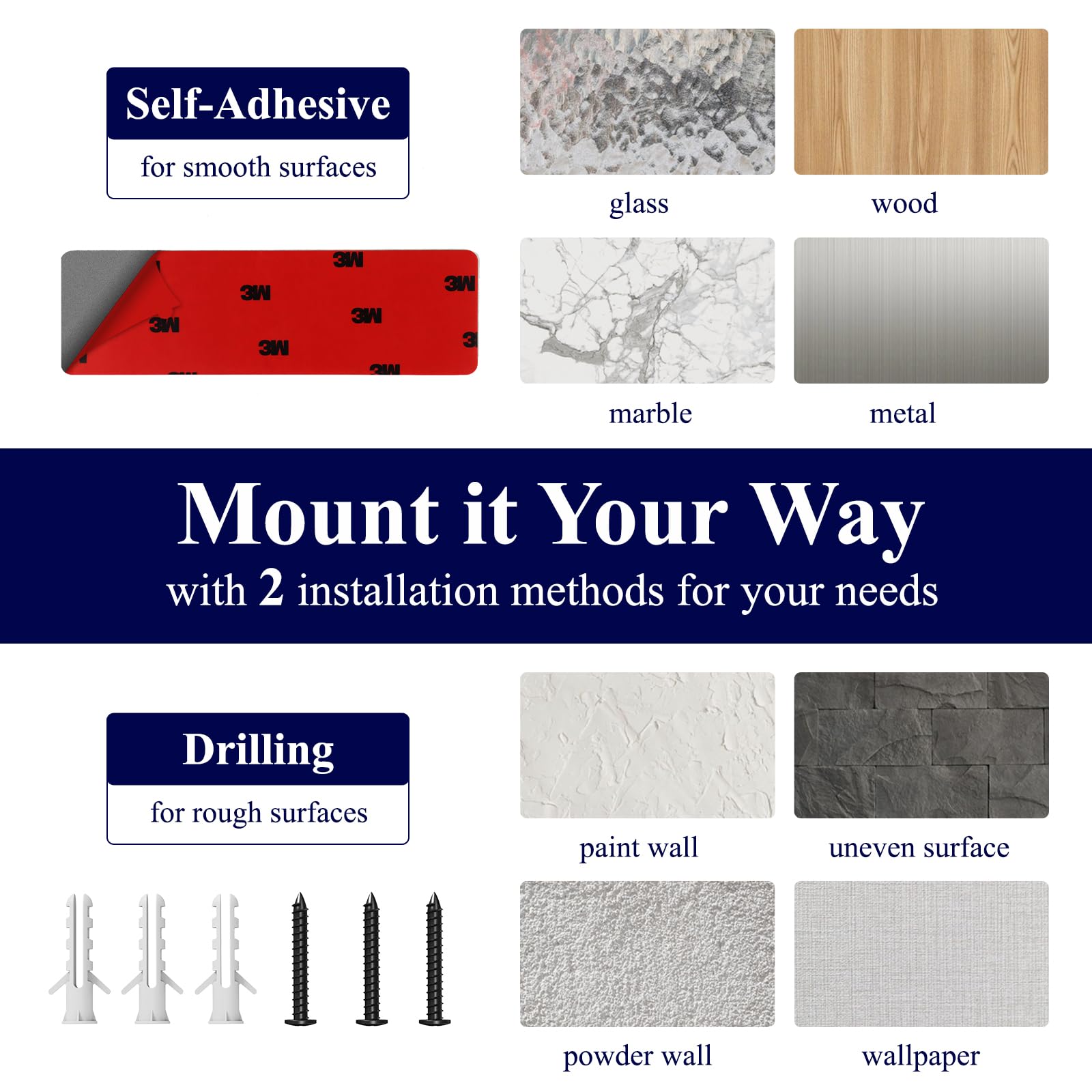 - EASY TO INSTALL: The Kitsure paper towel holder for wall mounting is designed for quick and hassle-free installation. It offers two installation methods: self-adhesive or drilling. With all the necessary mounting accessories and clear instructions included, you can easily attach the holder to the wall of your choice to meet your needs.