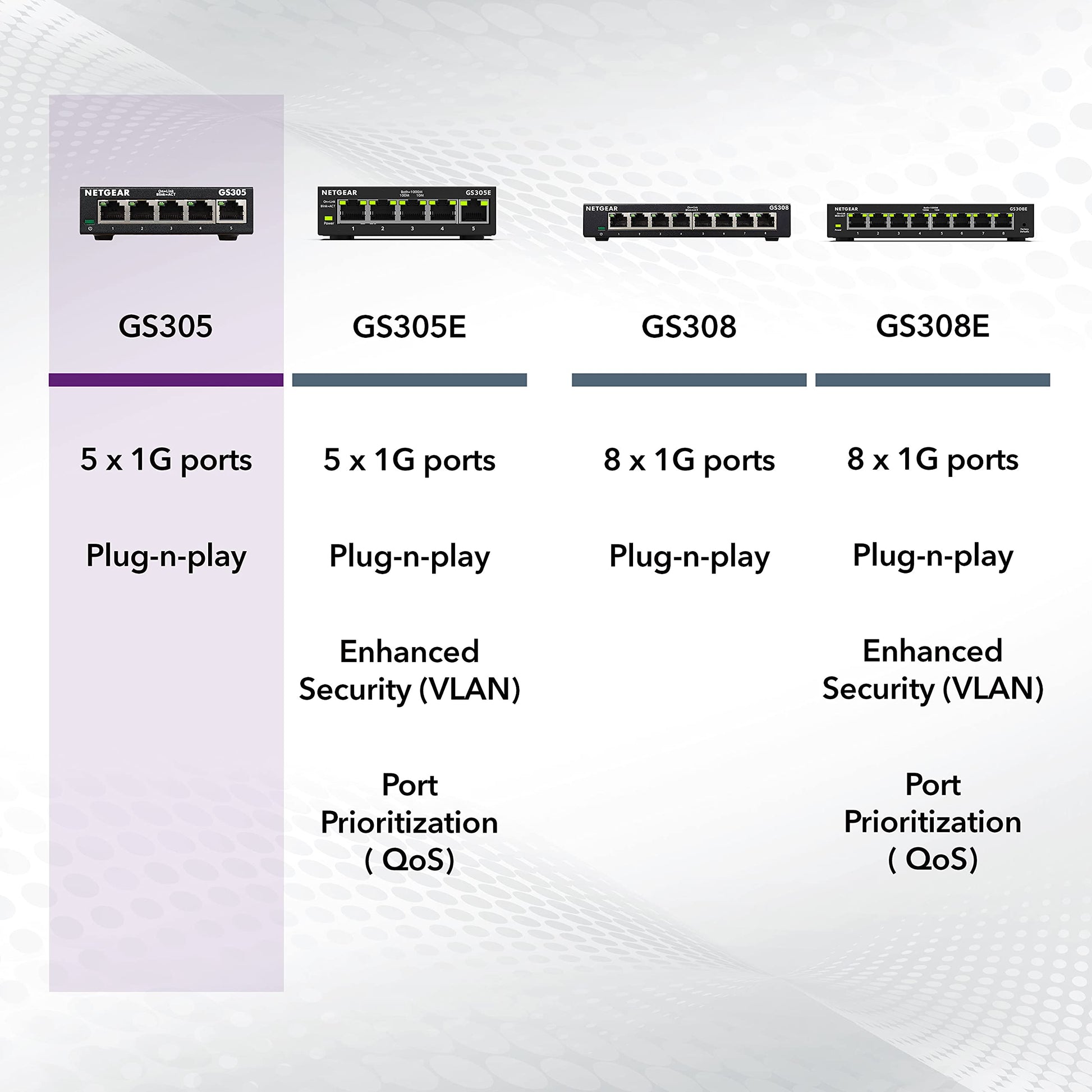 NETGEAR 5-Port Gigabit Ethernet Unmanaged Switch (GS305) - Home Network Hub, Office Ethernet Splitter, Plug-and-Play, Silent Operation, Desktop or Wall Mount