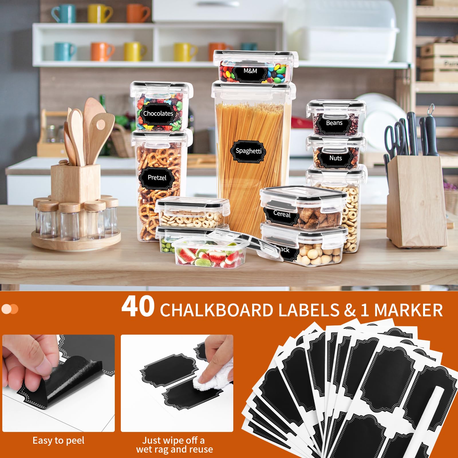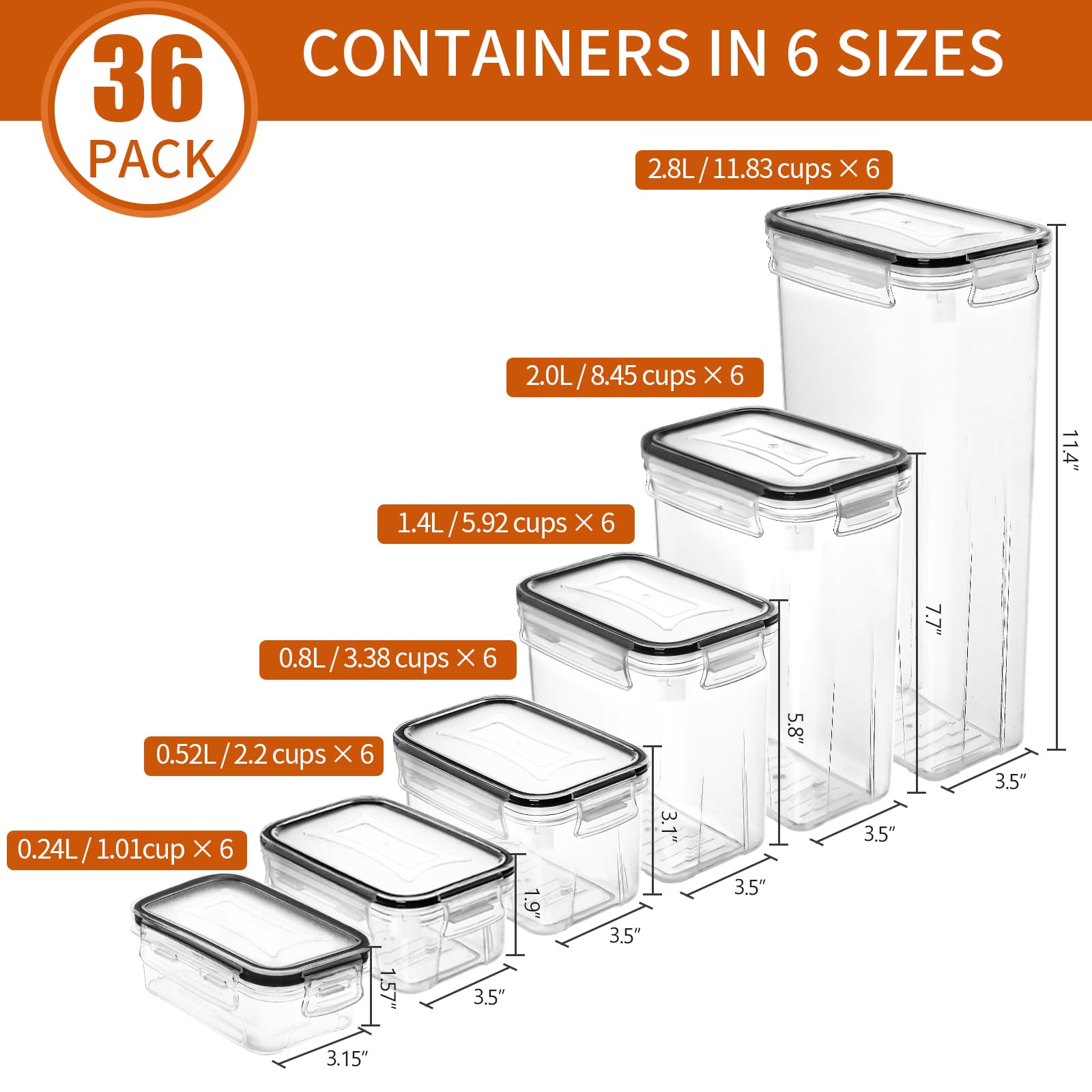 - Available in 6 Sizes - Our flour and sugar containers set come in 4 different sizes from 0.24L to 2.8L(Including 6Pcs 0.24L+6Pcs 0.52L+6Pcs 0.8L+6Pcs 1.4L+6Pcs 2.0L+6Pcs 2.8L). Plus, they come in a beautiful box with a chalkboard marker, 40pcs labels can easily help you mark your food and quickly find out what you need.