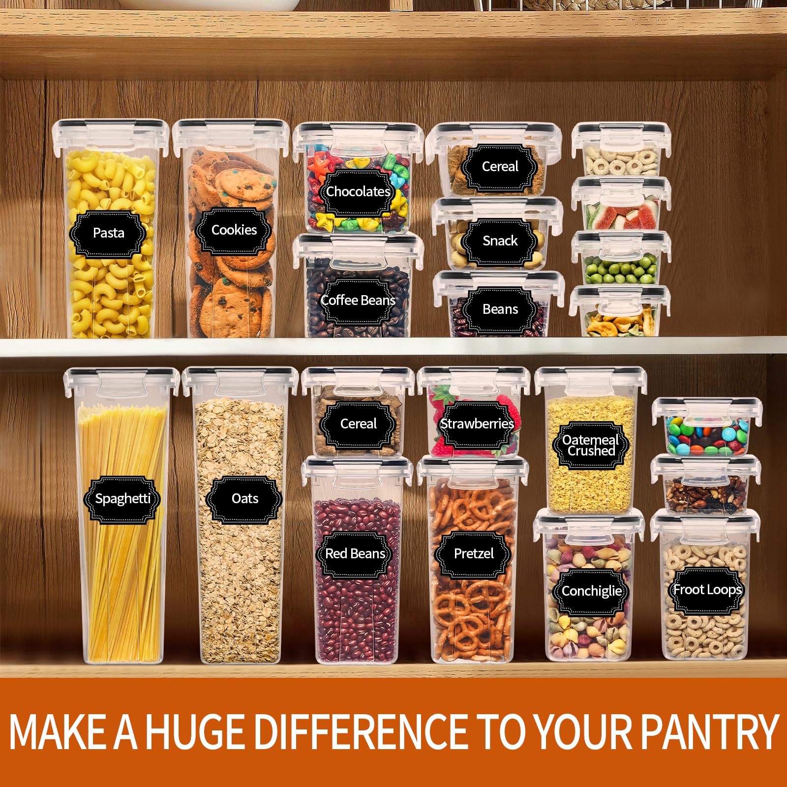 - Making Storing Easier - Skroam kitchen pantry organizers and storage set has an excellent design to minimize space, they are stackable and will easily fit into your pantry which enables you to get the kitchen organized and free up space. The clear plastic storage containers for pantry are perfect for storing flour, sugar, spaghetti, rice, nuts, cereal, snacks, pasta, and more.