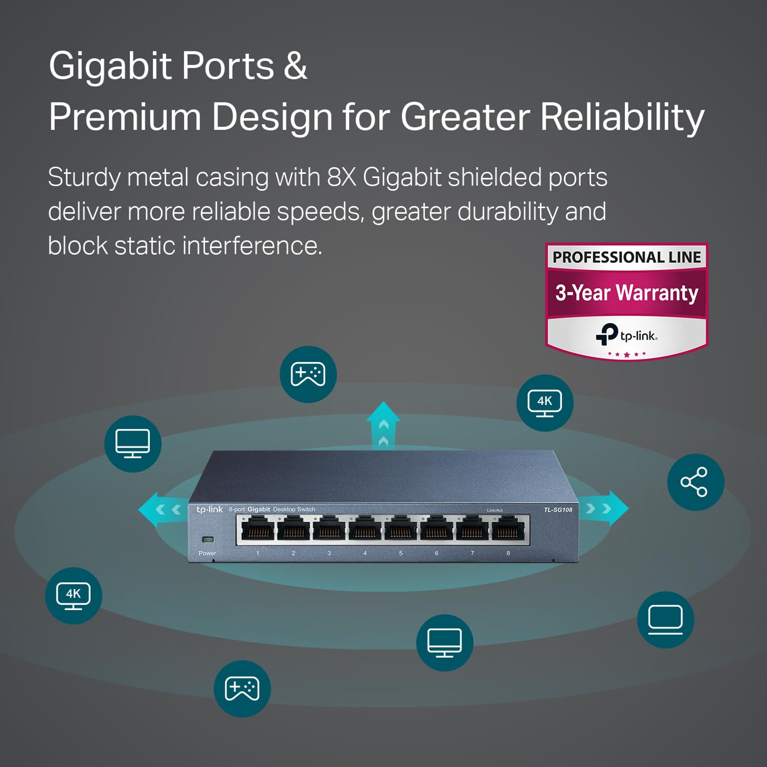 TP-Link TL-SG108 8 Port Gigabit Unmanaged Ethernet Network Switch, Ethernet Splitter Plug & Play Fanless Metal Design Shielded Ports Traffic Optimization
