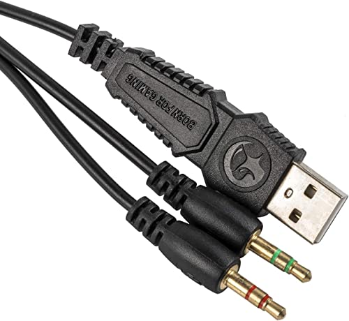 - Headset Specs - Sound: Stereo; Frequency Response: 20Hz - 20KHz; Speaker Size: 40mm; Microphone Type: Omnidirectional; Microphone Size: 6 x 5mm; Backlight: 7 Colors; Connectors: 2x 3.5mm Jack, USB (For Backlight); Mic Sensitivity: -38 ±3dB; Cable Length: 2.2M; Mic Impedance: ≤2.2KΩ; Net Weight: 252.6g ±15g; Product Size 9.1 x 7.3 x 3.7 in