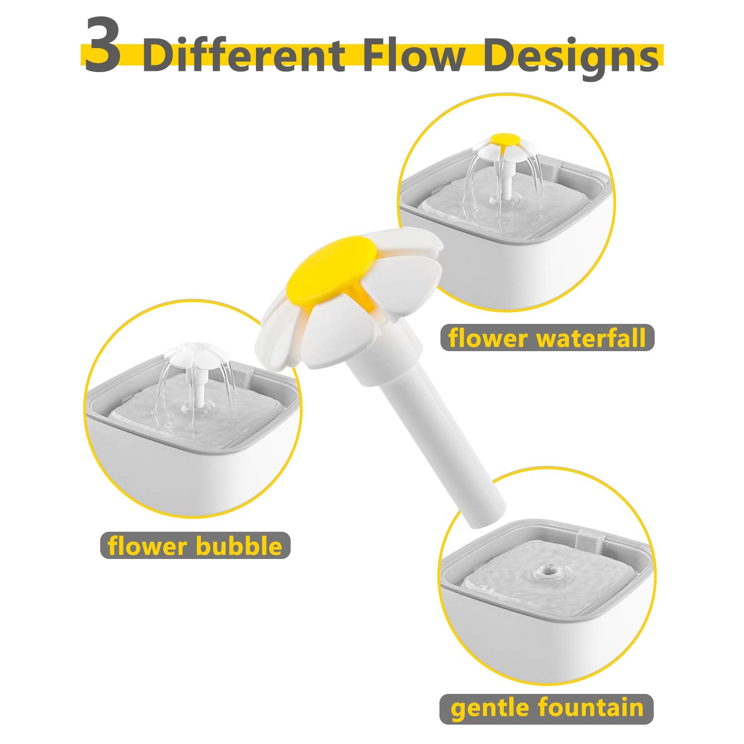 - 3 different flow designs – Veken Pet Fountain has 3 modes: flower waterfall, flower bubble, and gentle fountain. Each mode is specifically designed to meet the needs of various pets. The free-falling stream and bright color will attract curious pets to check it out.