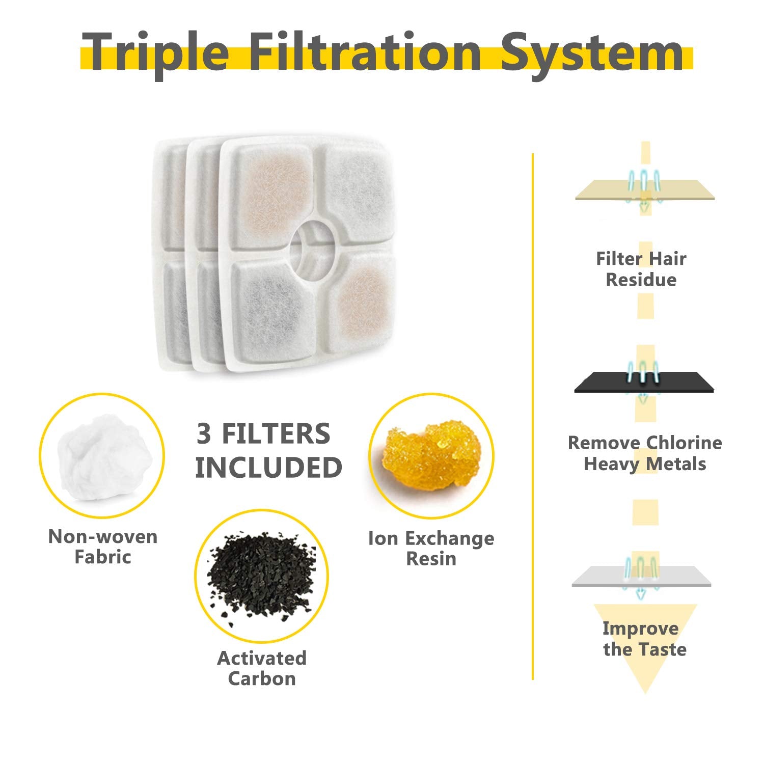 - Triple filtration system – The pet water fountain is equipped with 3 replacement filters, each composed of activated carbon, ion exchange resin and non-woven fabric, forming a triple filtration system to help keep your pets healthy and hydrated.
