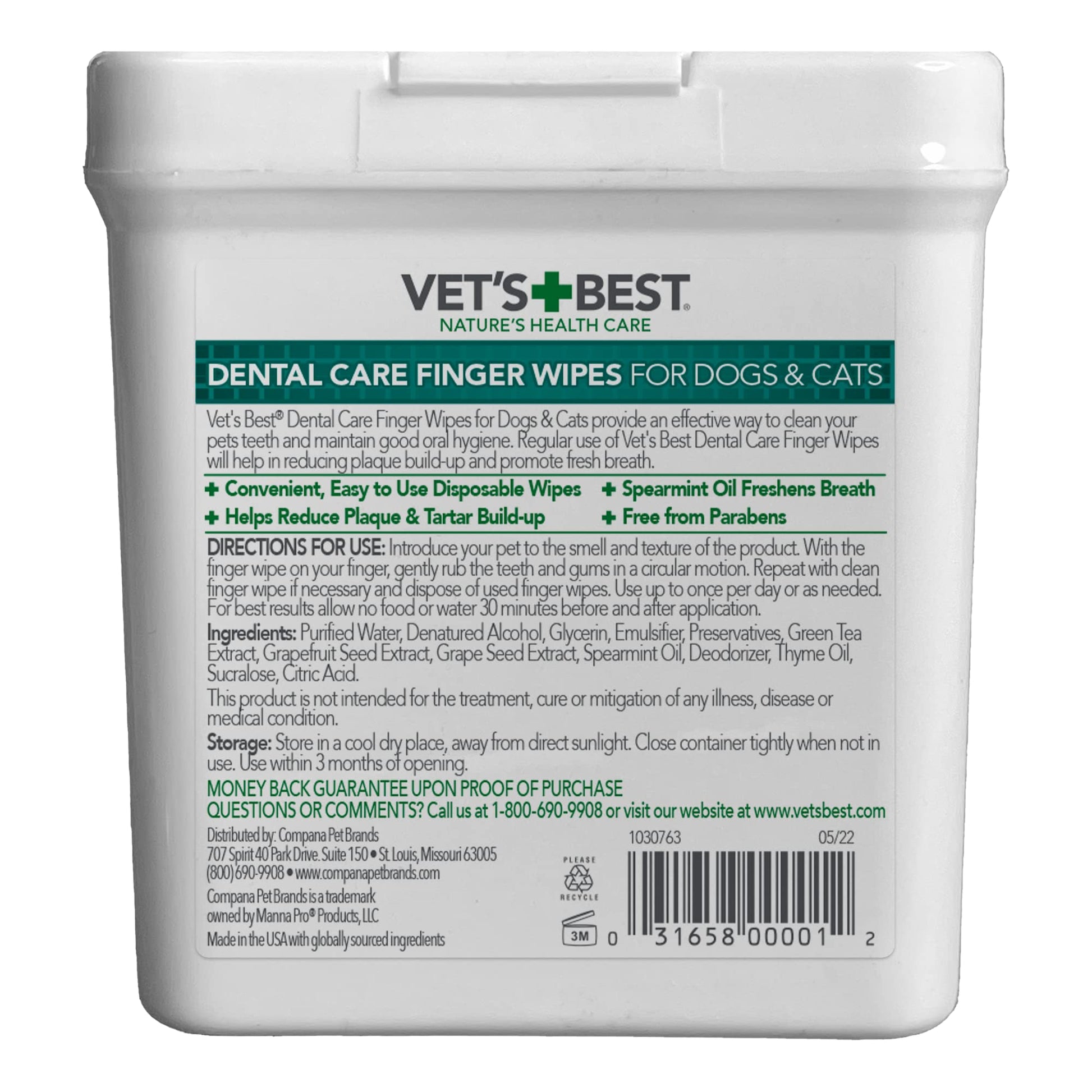 Details: Vet's Best Dental Care Finger Wipes for Dogs & Cats provide an effective way to clean your pet’s teeth and maintain good oral hygiene. Regular use of Vet's Best Dental Care Finger Wipes will help in reducing plaque build-up and promote fresh breath. This specially designed wipe allows the pet owner to be guided by their own touch when cleaning their pet’s teeth.