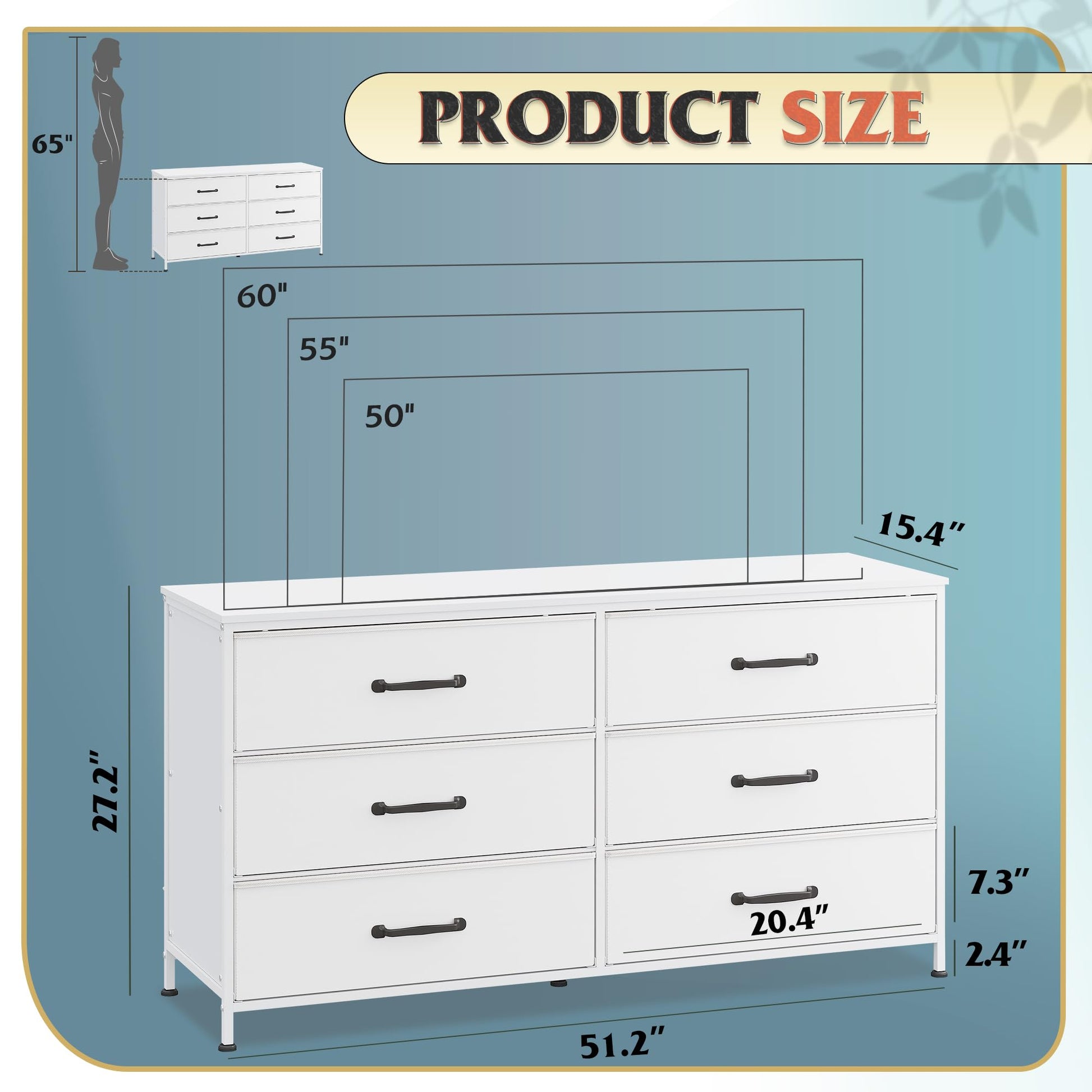 - 𝐒𝐔𝐅𝐅𝐈𝐂𝐈𝐄𝐍𝐓 𝐒𝐓𝟎𝐑𝐀𝐆𝐄: The double fabric dresser has 6 large drawers to hold clothes, blankets, toys, socks, or trouser. This dresser makes your space neat and tidy instantly. Overall dimension: 51.2"L x 15.4"W x 27.2"H.