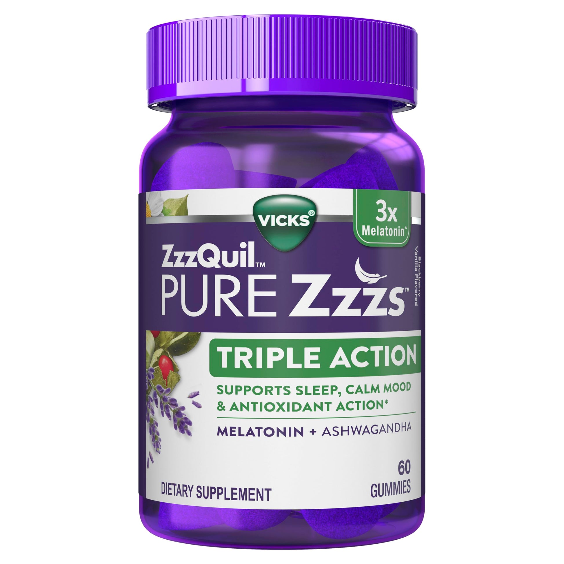 ZzzQuil PURE Zzzs Triple Action, 6mg Melatonin Gummies, 3X Melatonin Sleep Aid with Ashwagandha, Calm Mood & Antioxidant Action, Sleep Aid for Adults, 6 mg per serving, 60 Count
